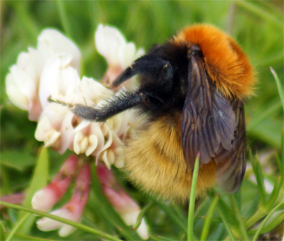 The Moss Carder Bee, has a bright orange upper body & yellowish lower body. The adult has hairs on the thorax and abdomen that are mainly ginger, mixed with black on the abdominal segments (however - not on the mainland forms).